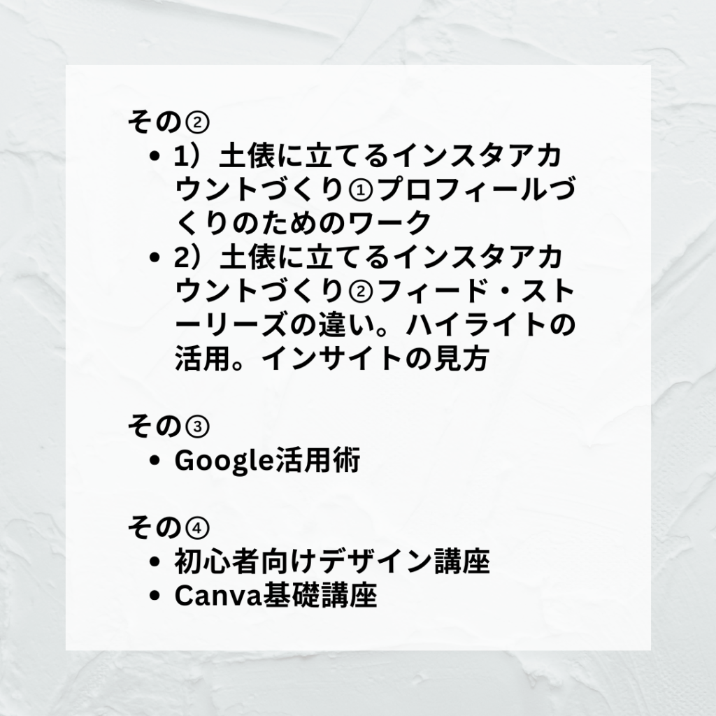 そんな方のために、SNSそれぞれの目的や事例紹介、デザインツールの紹介、Instagramの基本的な機能や使い方、そして知ってるようで知らないGoogleアカウントの便利機能などなど、これだけ聞くだけでも価値あり! です。